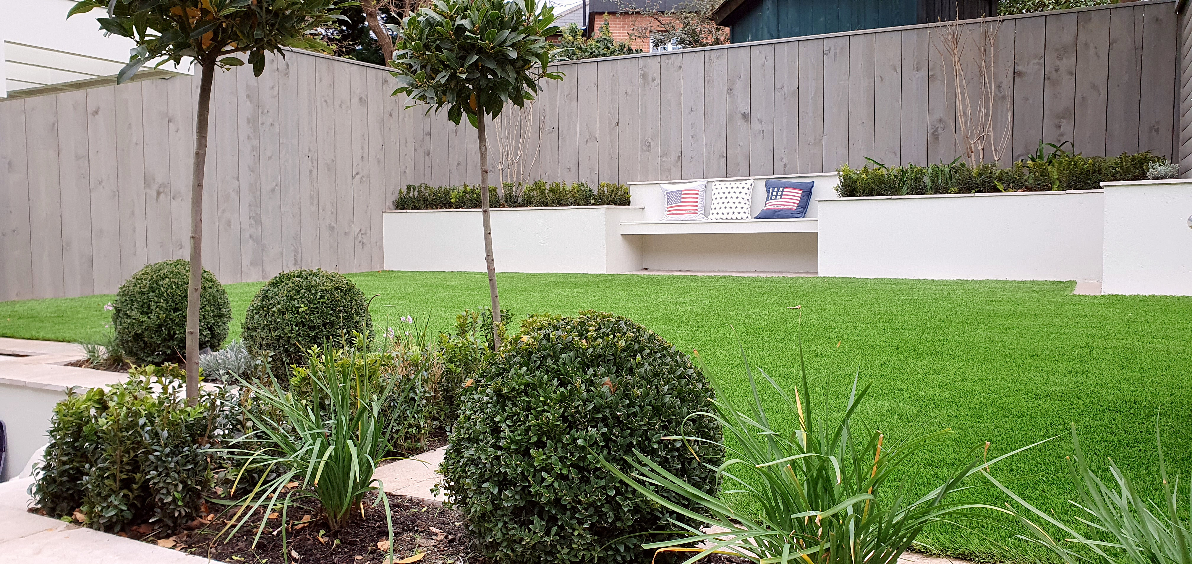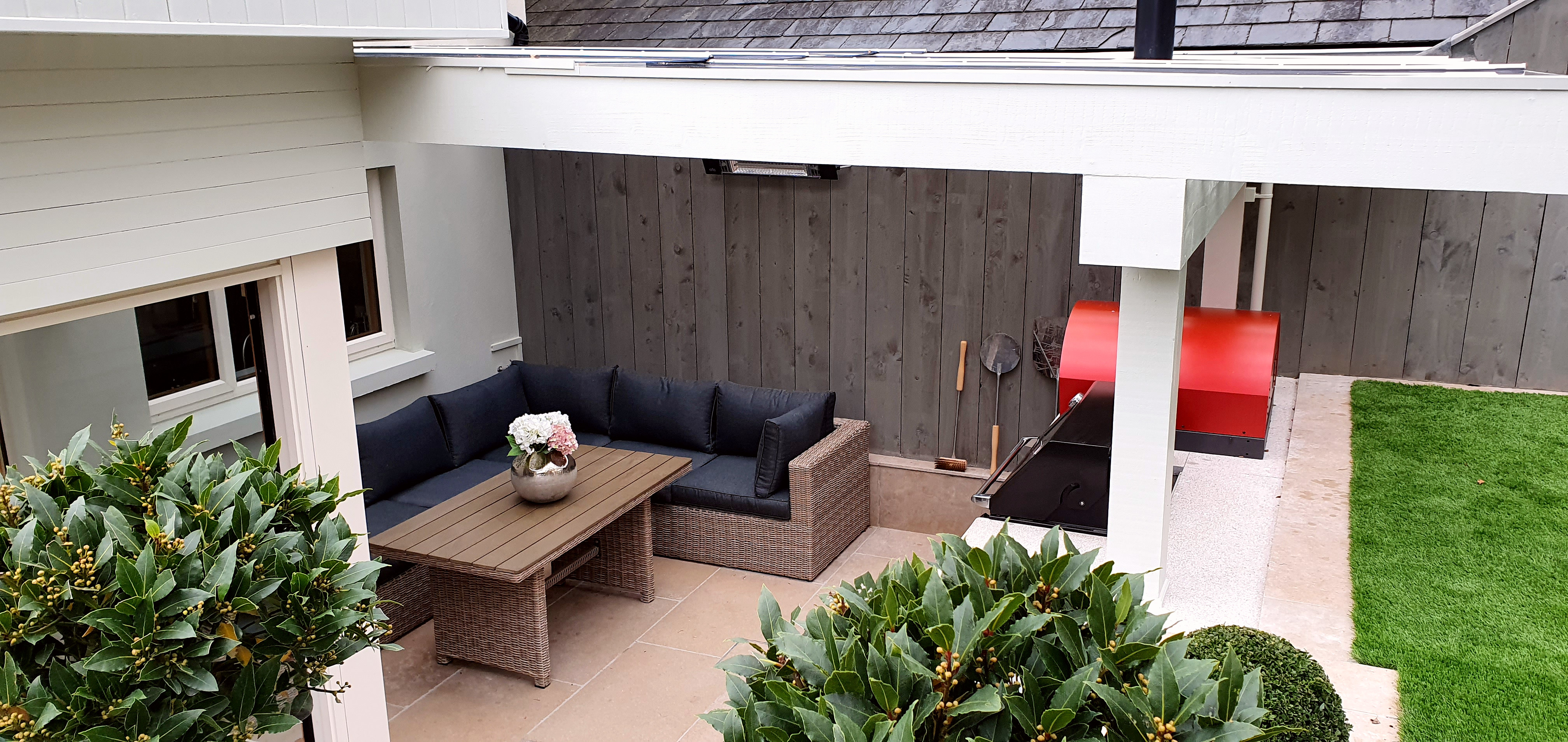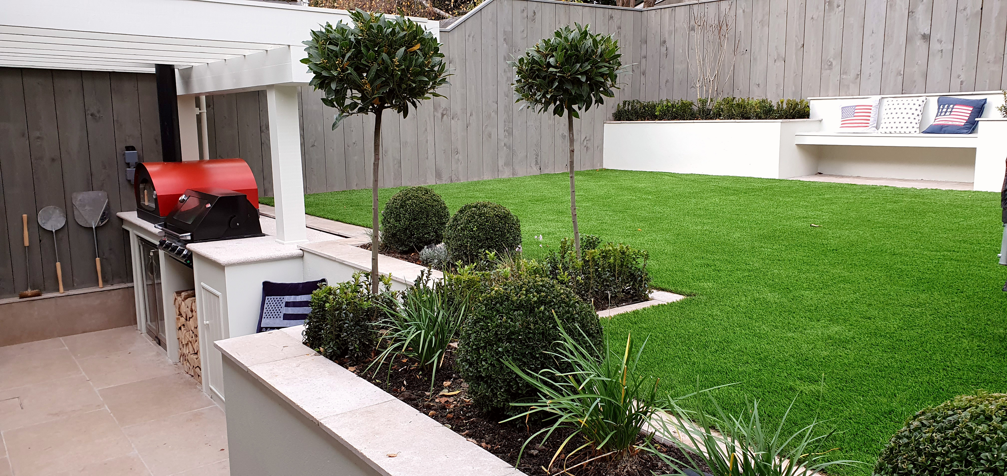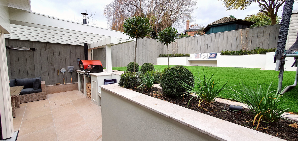 This was a challenging project from start to finish, design was complicated due to the two-tiered garden and there was no side access, so everything went through the house. The brief was full of wonderful ideas so our job to get as much in as possible. We managed to get everything on the wish list, even the storage unit. What we created in this space was spectacular, walking from the house straight out onto Egyptian limestone paving leading to the outdoor living room, complete with an Il Forno pizza oven, built in beefeater BBQ, storage units and drinks fridge, to the other side of the patio steps up to the upper level of the garden with a floating bench set into the raised planter along the back, an artificial lawn was a must so our 50mm Grand Residence was used.